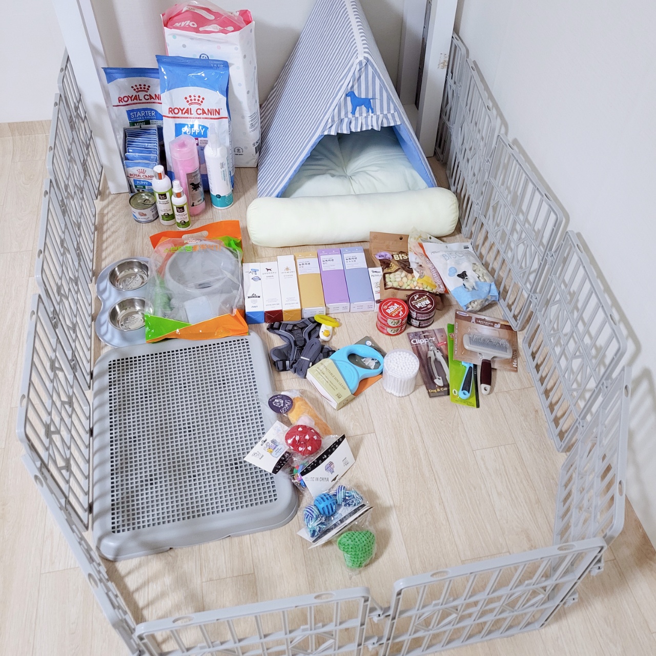 일단 집에 데려가서 1주일 정도 적응시키고 병원에 가서 2주 간격으로 5차까지 주사를 맞기로 했고, 퍼피에 대해 아주 기본적인 세팅(?) 방법을 알려주셨다.